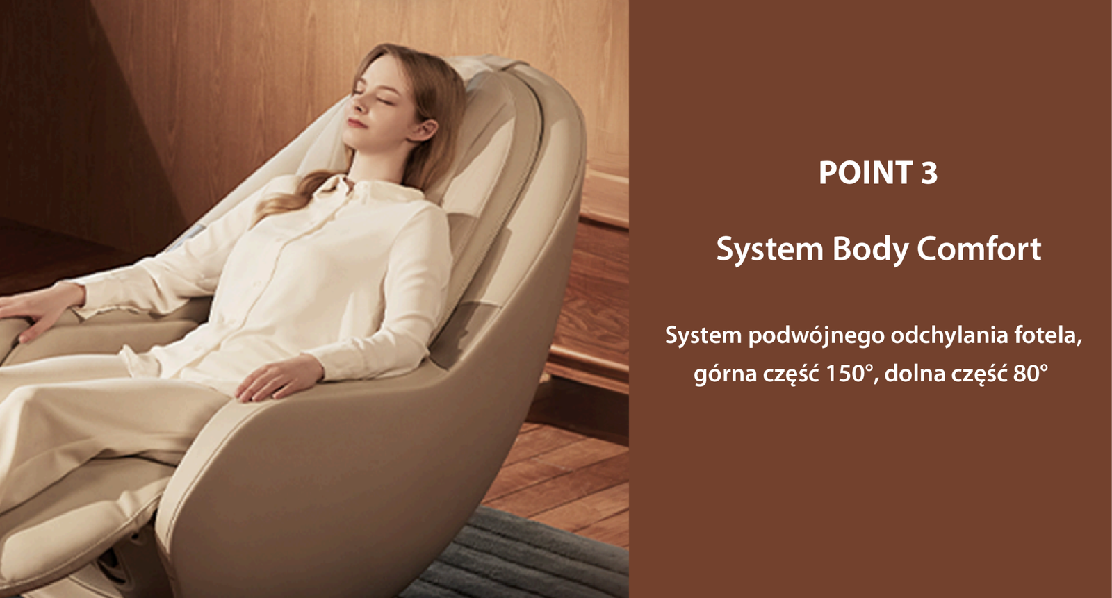 - Pause M6 umożliwia jednym dotknięciem odchylenie oparcia do 150°, a wbudowany podnóżek można unieść do 80°, co pozwala uzyskać komfortową pozycję „zerowej grawitacji” podczas masażu lub odpoczynku.